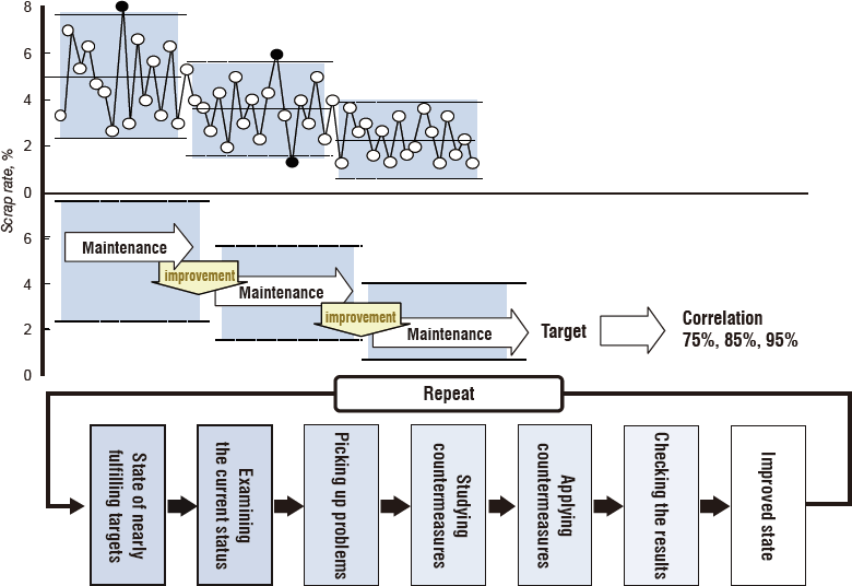 The upper and lower control limits should be set considering the casting weight in a flask as explained in the examples below in such a way as 80 to 85, 85 to 89, or 90 to 93. The control limits should be adjusted by making tests every time when casting conditions such as casting shape, single casting weight, casting weight for one flask, and others are changed.